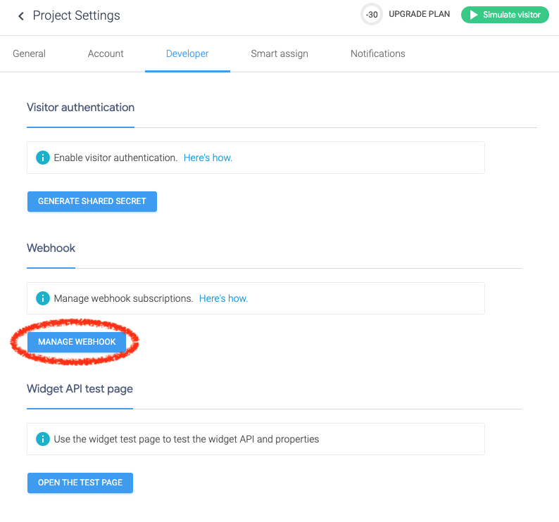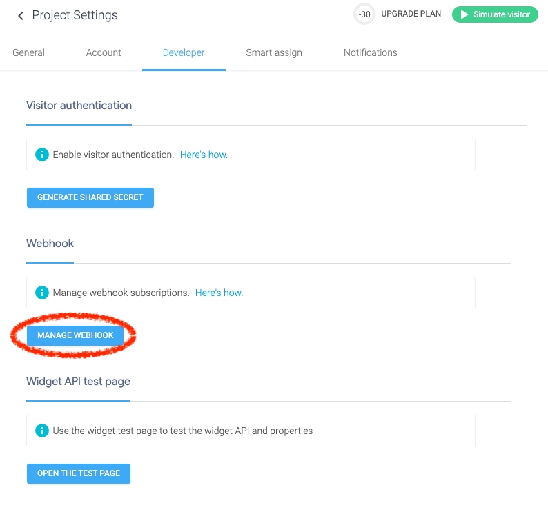 Now move in the Settings > Project Settings > Developer section and click on "MANAGE WEBHOOK"