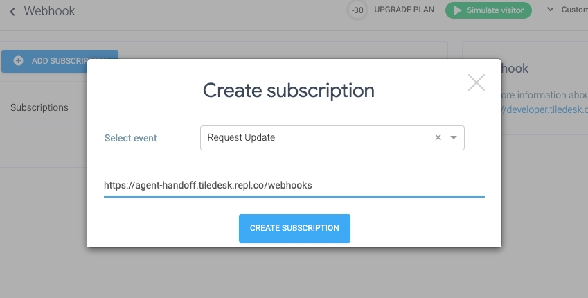 Add this new webhook, taking care that the endpoint corresponds to the endpoint of your forked replit application followed by /webhooks: