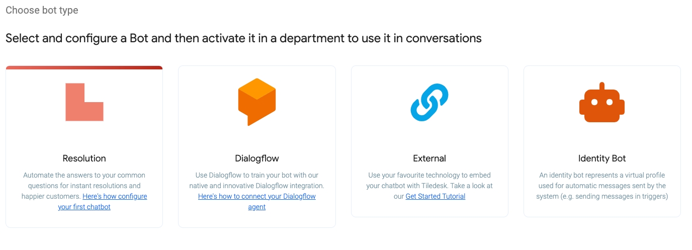 Now move to the Bots section and create a new bot. Choose "Resolution" as the bot type.
