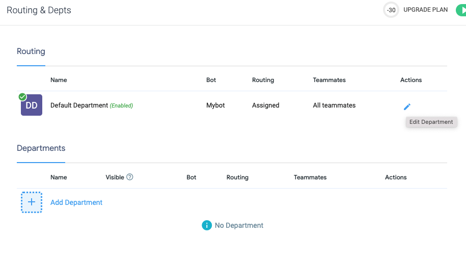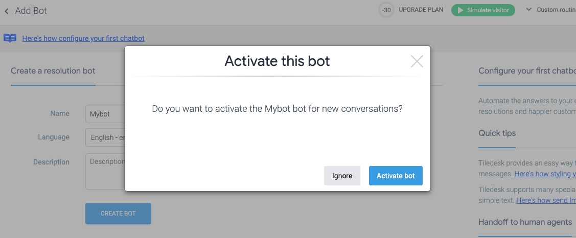 Name it as you prefer, create it and press "Activate" when asked. This will "attach" the new chatbot to the Default Department making the bot immediatly available to end users.