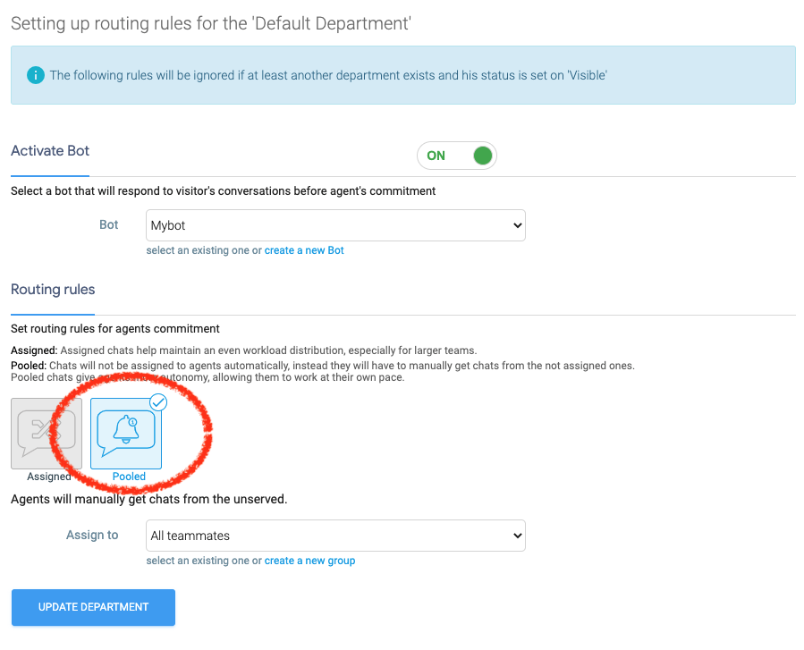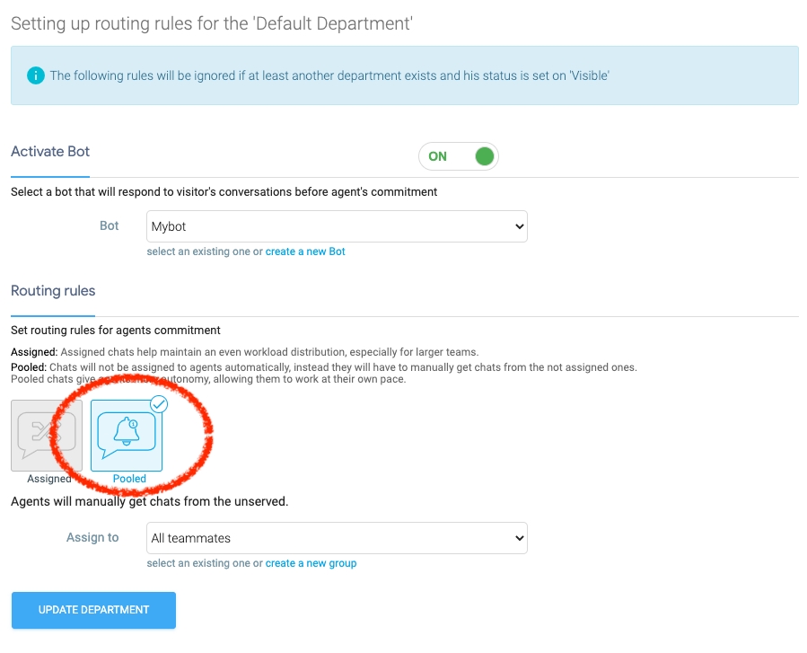 Select the "Default department" and change the Routing rules from the (default) "Assigned" to the "Pooled" mode.