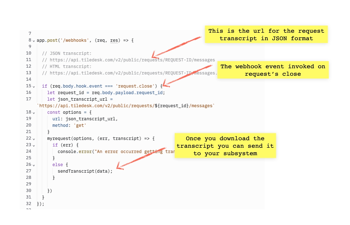 With this tutorial we demonstrate how to easily get the request transcript in JSON format using the request's close event. This event is very useful if you want to send, for example, a personalized email, or if you want to save the conversation messages on an external system or save it on your own CRM.