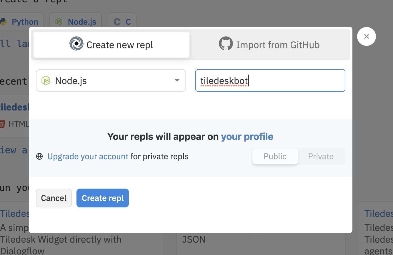 Go on the repl.it and press "+ new repl" button. Then select Node.js as the programming environment and choose a unique name of you repl propject. We used tiledeskbot.