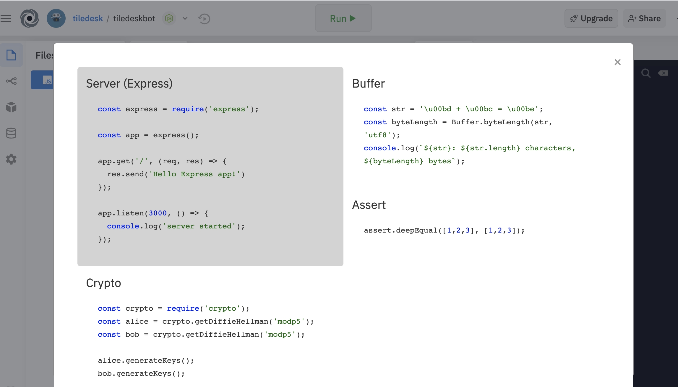 npm install @tiledesk/tiledesk-chatbot-clientYou can find the full code of this tutorial on the repl linked here: