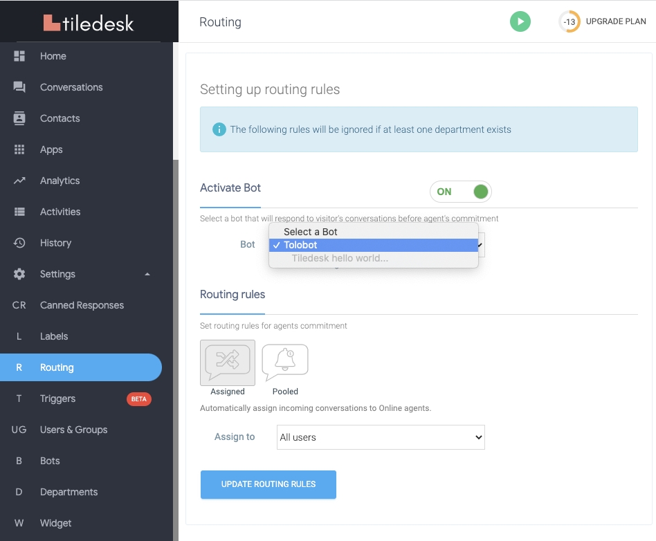 Now that our code is ok, we should configure a routing rule to make this chatbot available to our users. Select the Routing option and configure the corresponding rules as follows, activating the Bot, selecting Tolobot and marking the Bot only option for this routing, so Tolobot will be the only available Agent.