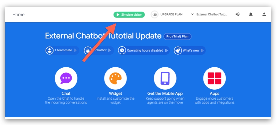 To test our chatbot press the green "Simulate visitor" button in the console's header, as shown in the following figure: