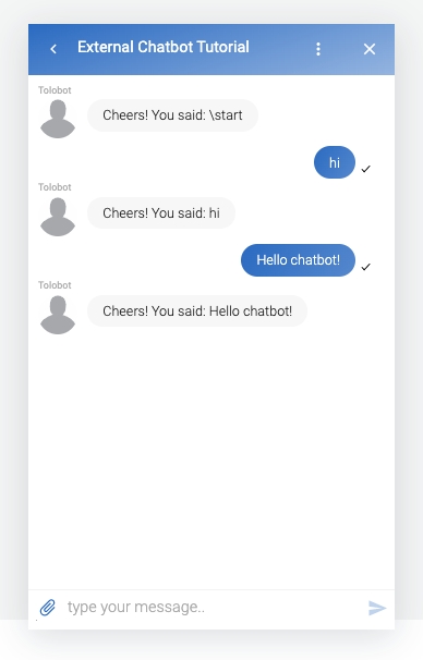 Press the New conversation button on the widget. A conversation will open on the default routing. A hidden \start message is sent to your bot who will reply echoing that message, as configured in the code. If you send new messages to the chatbot it will reply with a message echo, as in this example: