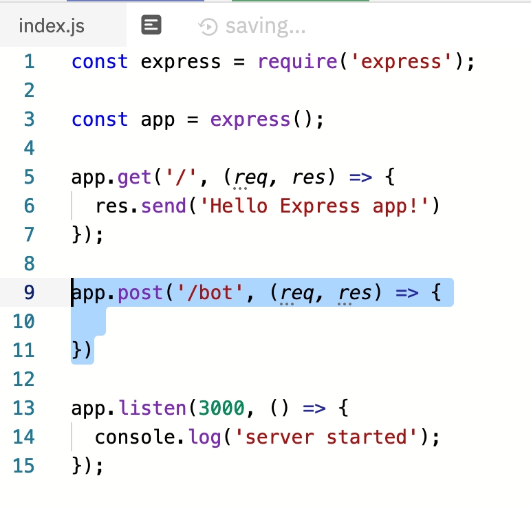Go back to the repl project. In the index.js file modify the /bot service, copying and pasting the following code: