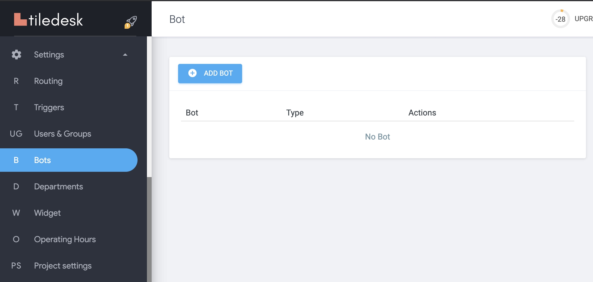 Now move back to the Tiledesk project console and open the Settings menù on the left panel of our Tiledesk project, selecting the Bots option:
