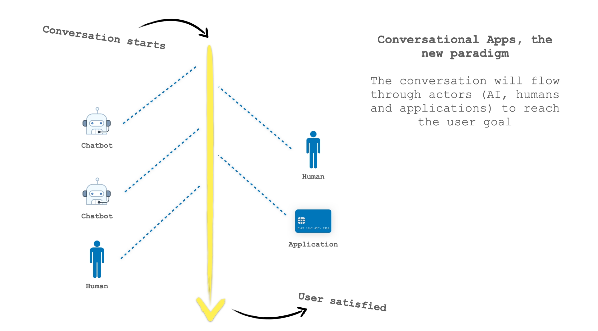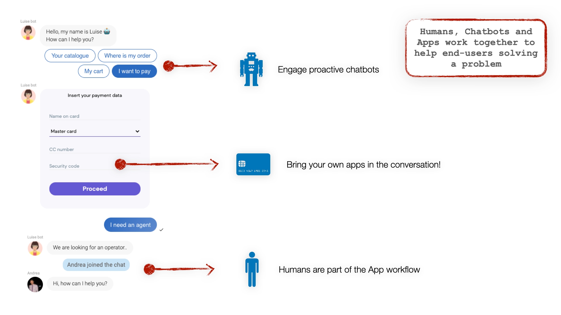 The conversation not only should be perceived by the end-user as seamlessy flowing between all the actors. The conversation should also seamlessly and easily flow for the conversation designer. The one who "design" the conversation flow must have simple "directives" or "APIs" to move the conversation through all the involved actors, when needed.