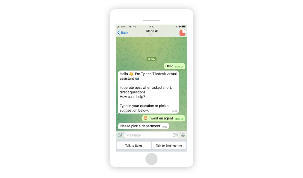 This integration allows you to connect your company's Telegram bot to your Tiledesk account, thus creating a tunnel between the two platforms. Therefore customers can reach your support simply by writing to your Telegram bot and these messages will be delivered to the Tiledesk webchat, along with messages from other channels.