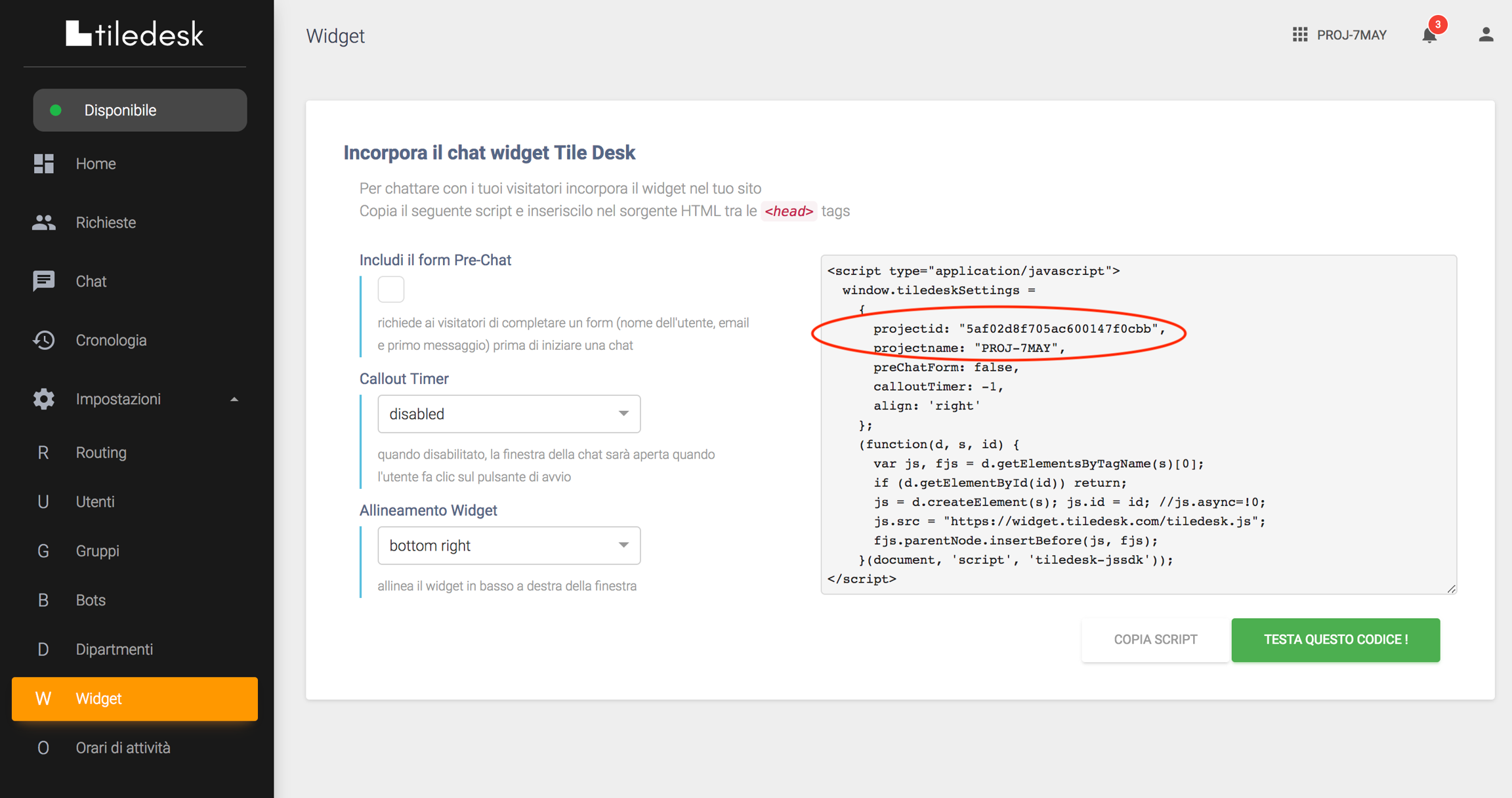 </script>To get your TILEDESK_PROJECT_ID go to the TileDesk Dashboard and click on the Widget item of the menu: