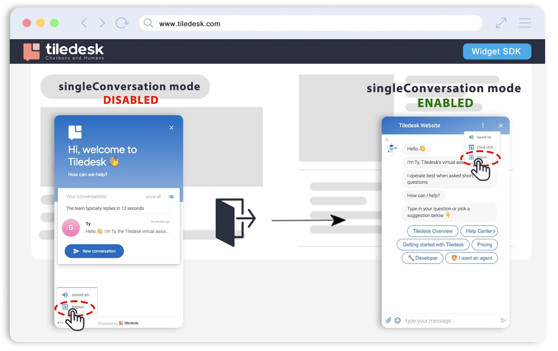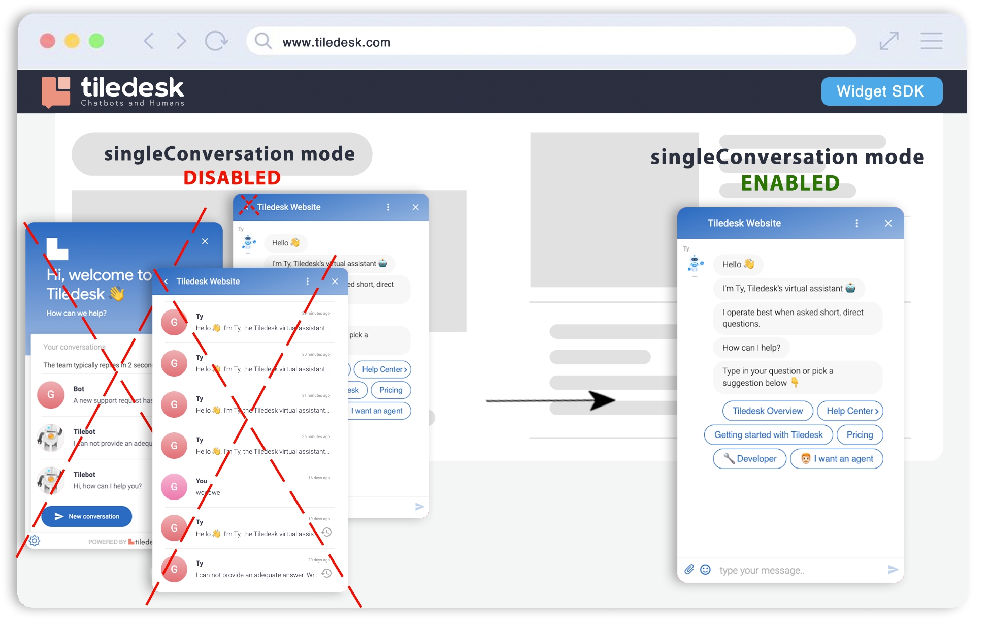 As with the other widget setting parameters, singleConversation mode can be enabled in various ways: as a url parameter or as a property of tiledeskSettings.