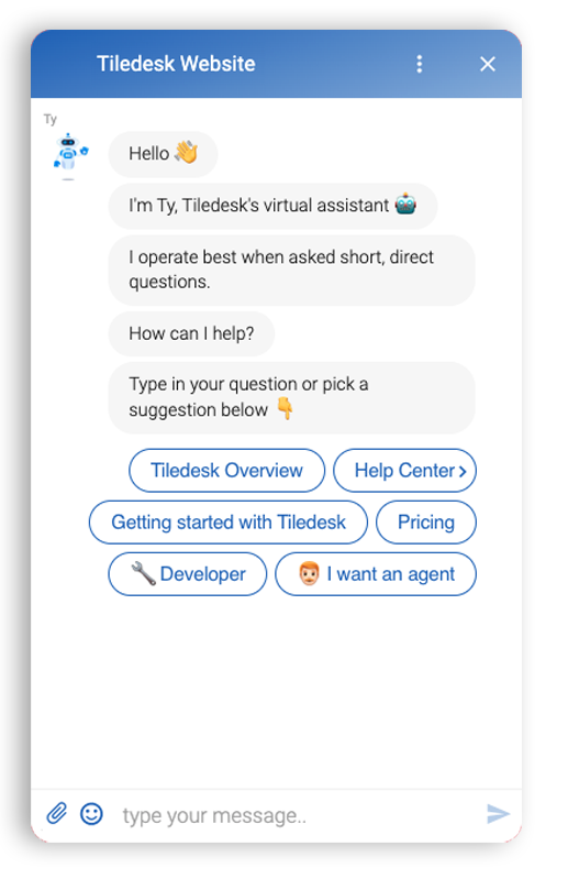 As with the other widget setting parameters, singleConversation mode can be enabled in various ways: as a url parameter or as a property of tiledeskSettings.