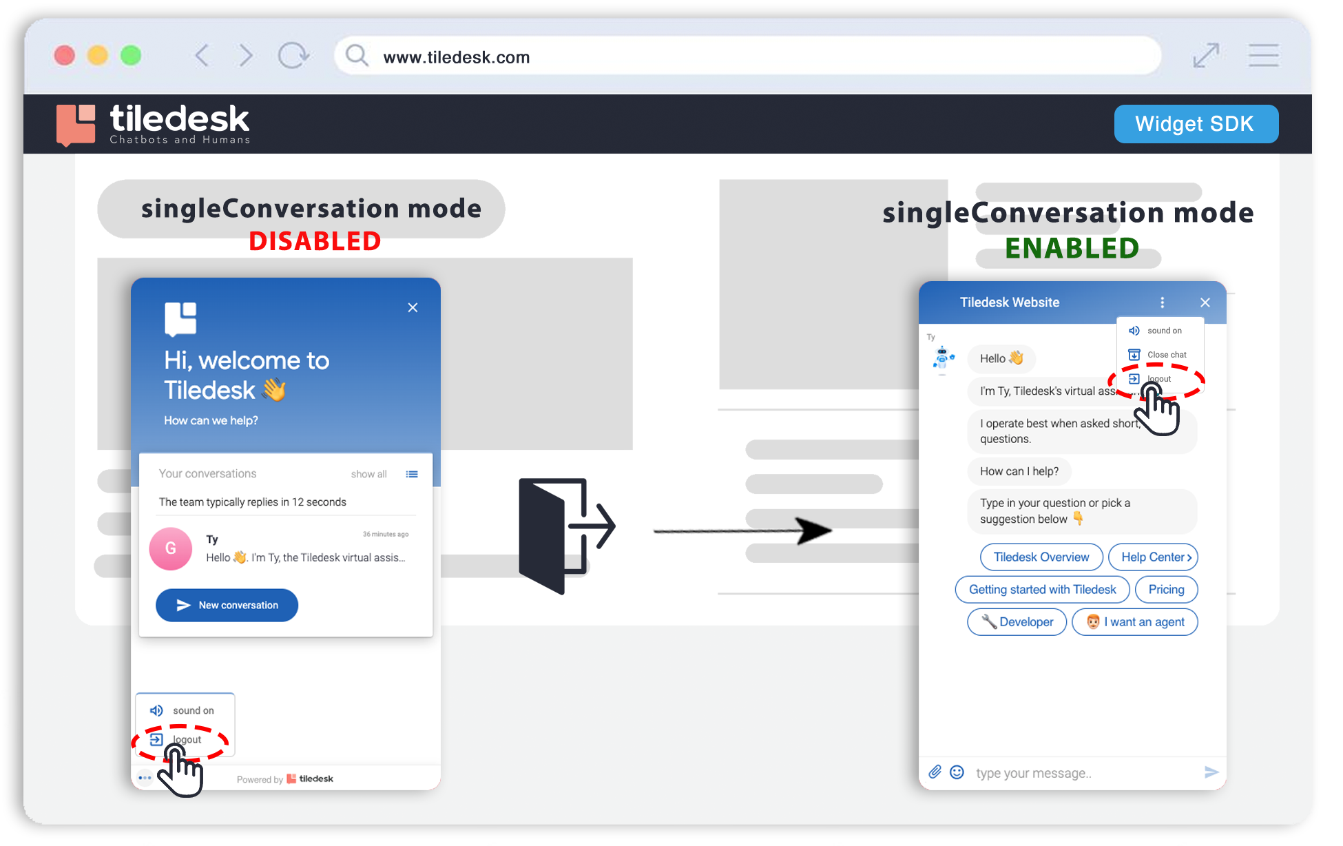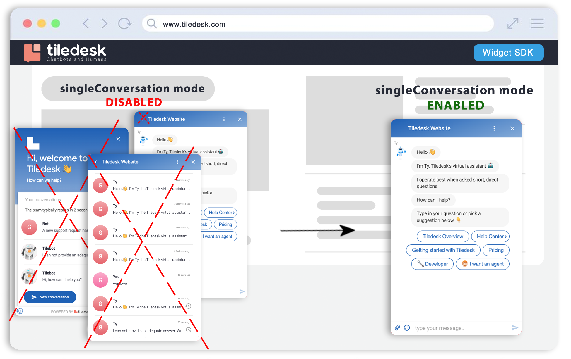 A new feature in Tiledesk widget settings will prevent your customers from starting a new conversation if they already have one open. This change makes conversations more of a continuous thread, preventing customers from reaching out to your team multiple times, which saves your team time and effort. This feature is named as Single Conversation