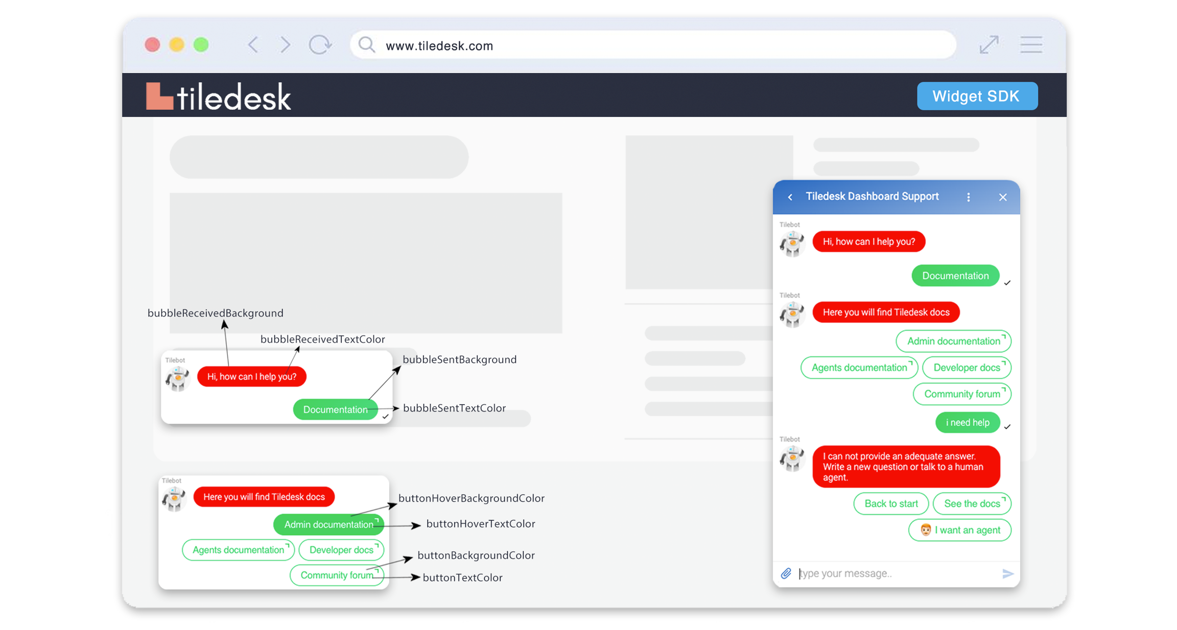 These set of attributes modify the Widget style for messages (i.e. message background color, text color, buttons color etc.)