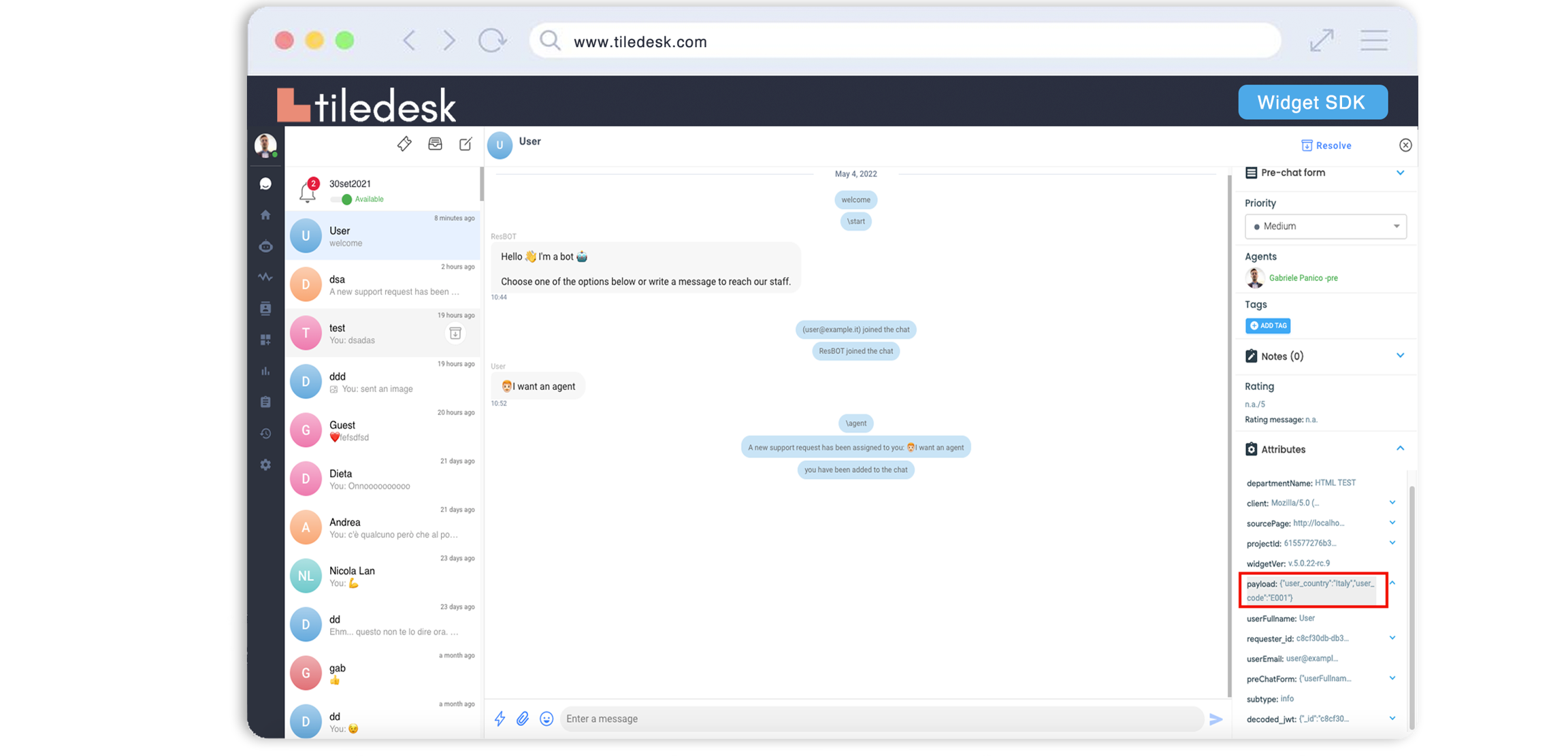 Widget allow you to pass some custom attributes as key-value object in window.tiledeksSettings object or as a Url parameter with the tiledesk_customAttributes prefix.