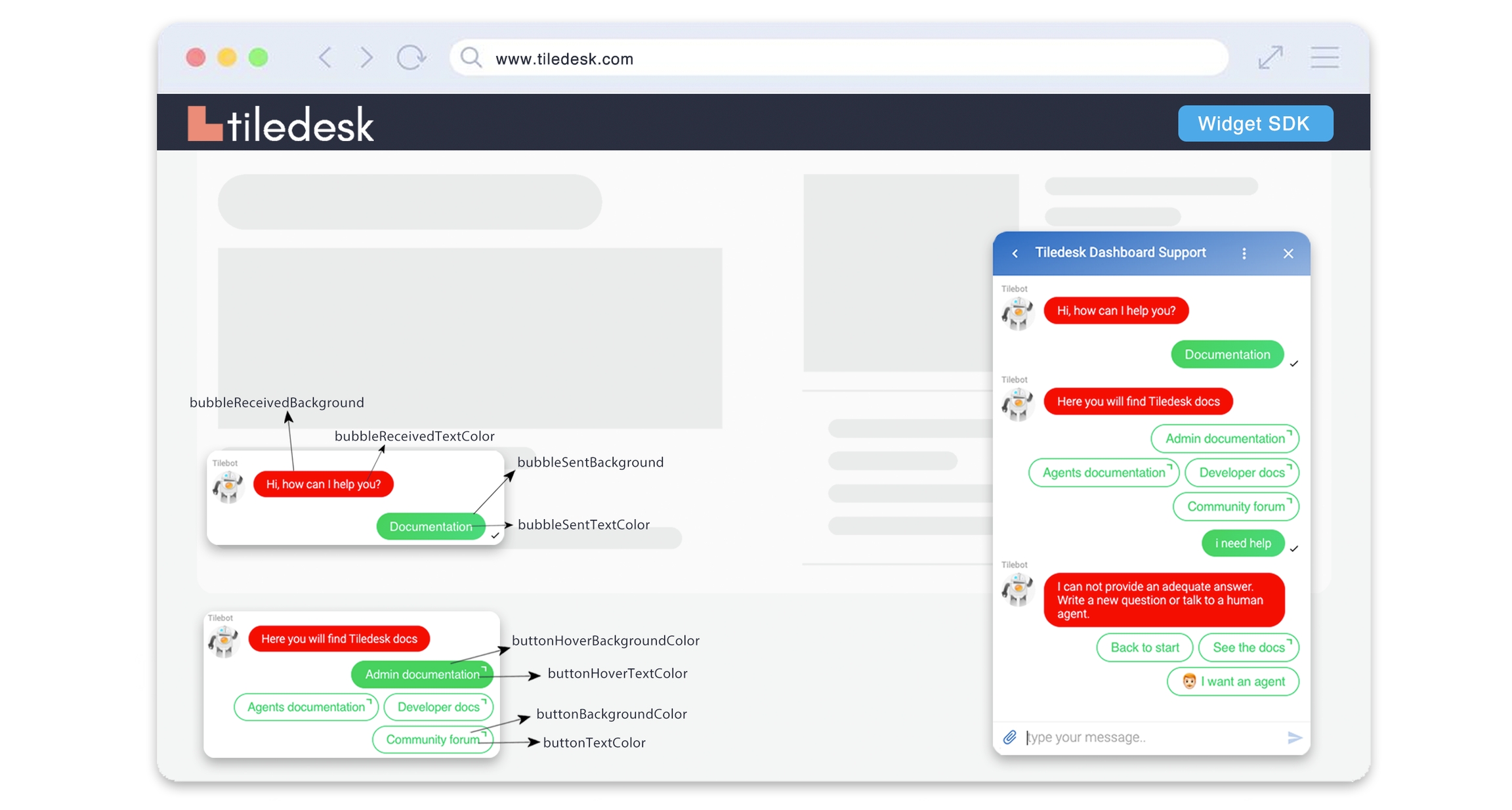 You can customize the widget passing the following parameters to window.tiledeskSettings object.
