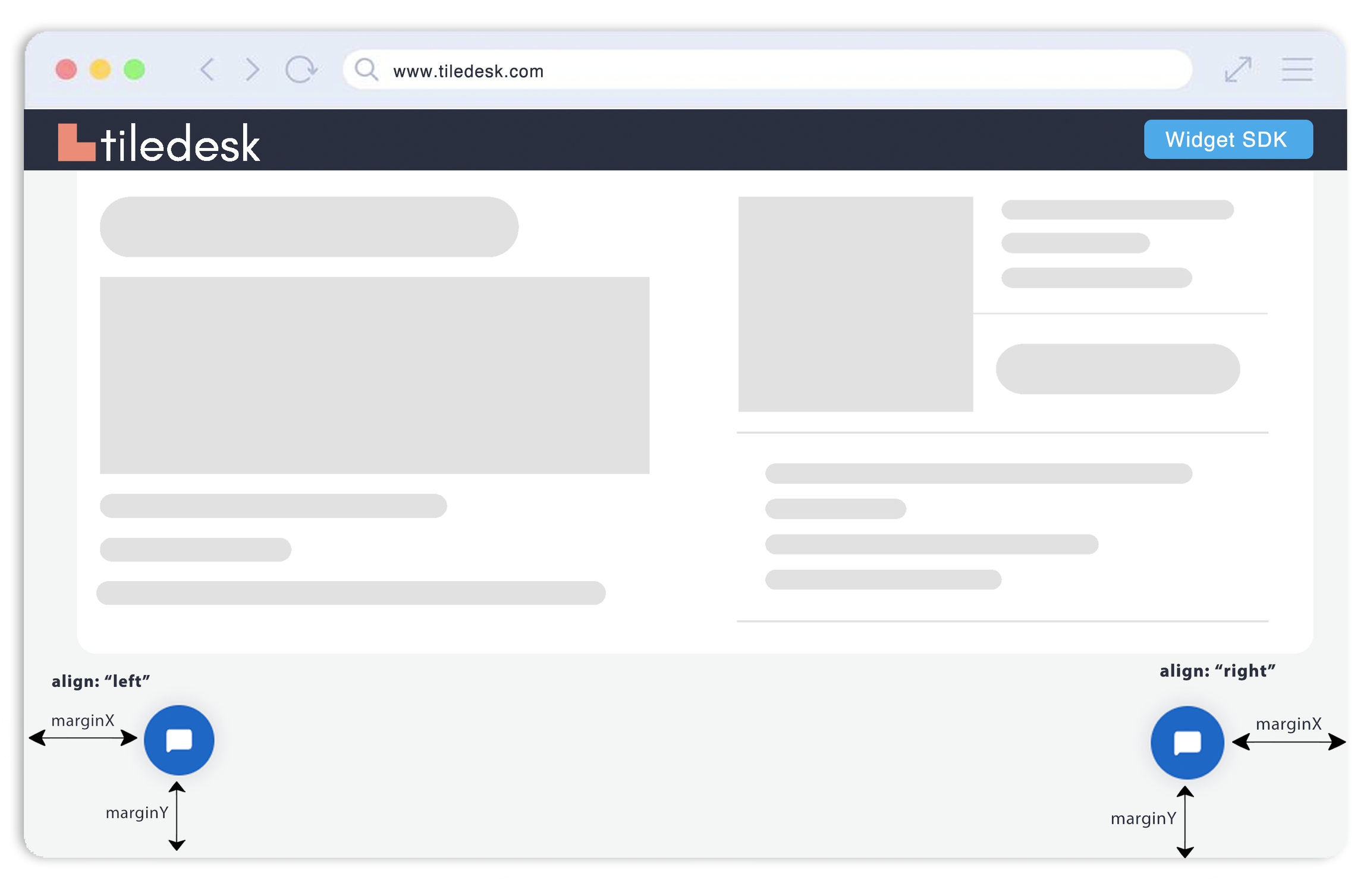 Sometimes you may want to show Tiledesk Widget on left or right side of your website. Moreover, you may also want to get more/less distance between widget and website margin. The following example shows a widget aligned on left side and with custom margin from X and Y axis.