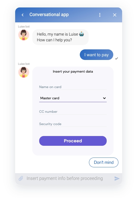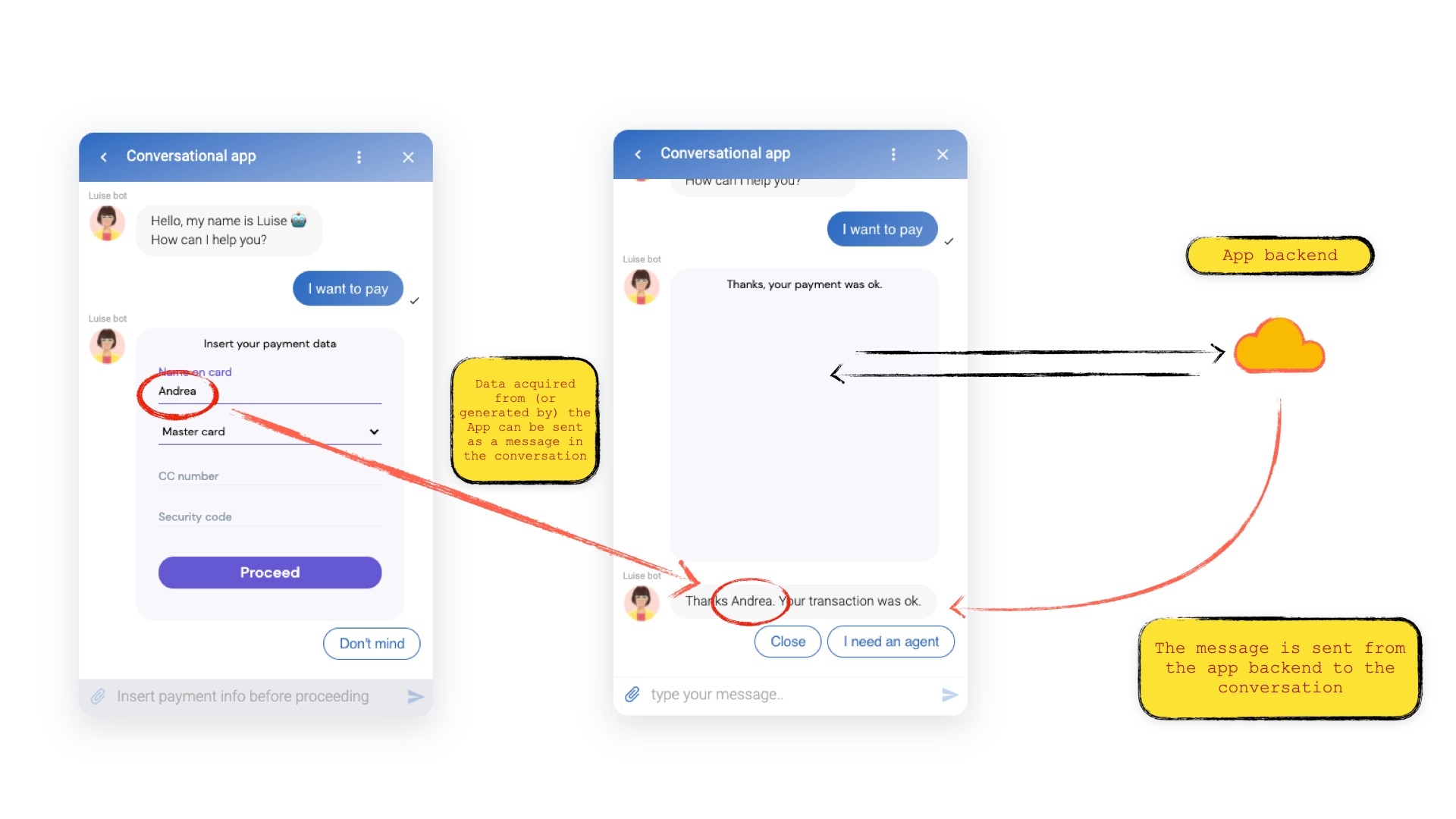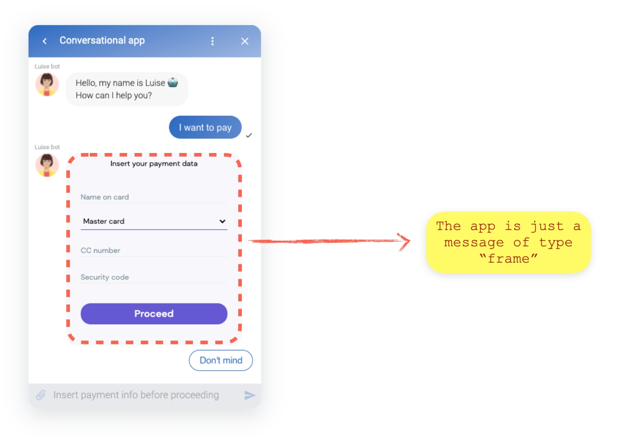 Data isolation is less obvious but probably more important. In Tilesk, the conversational app is an entire web application running on his own web server on the HTTPS protocol. This means that data exchanged with the app is unkonwn by Tiledesk and is exchanged directly between the app and his own backend. This pertains to privacy and security. Imagine for example that a user should pay for a cart. The chatbot can provide to the user a payment-app where the user is asked about his credit card and these data are directly exchanged with the payment backend, never with Tiledesk. No info about the transaction is stored into the conversation. Through an app only the actors interested in the interaction are involved.