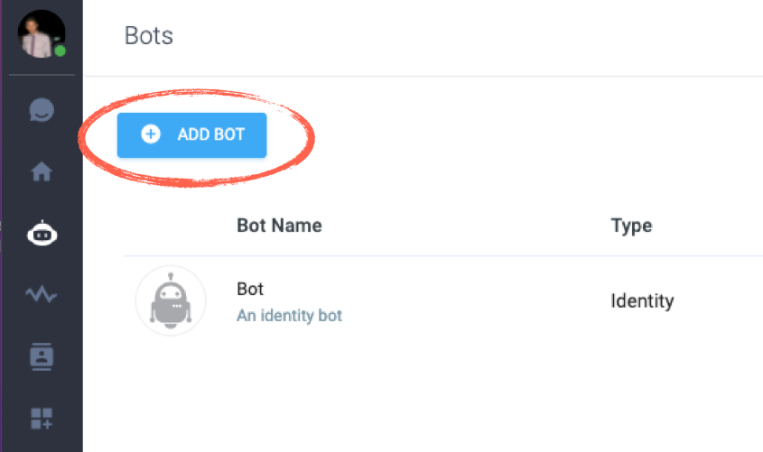 Select the chatbot icon on the left menu, then press the "ADD BOT" button: