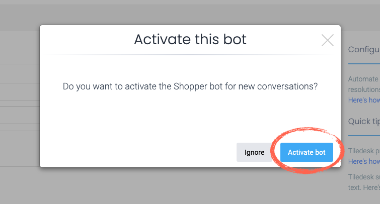 When asked, choose "Activate bot". In this manner the new chatbot is immediatly available as soon as someone starts a new conversation.