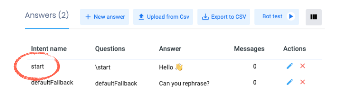 Then modify the start intent, adding a Quick reply button using the chatbot microlanguage (simply use an asterisk followed by a space and the quick reply text), as this: