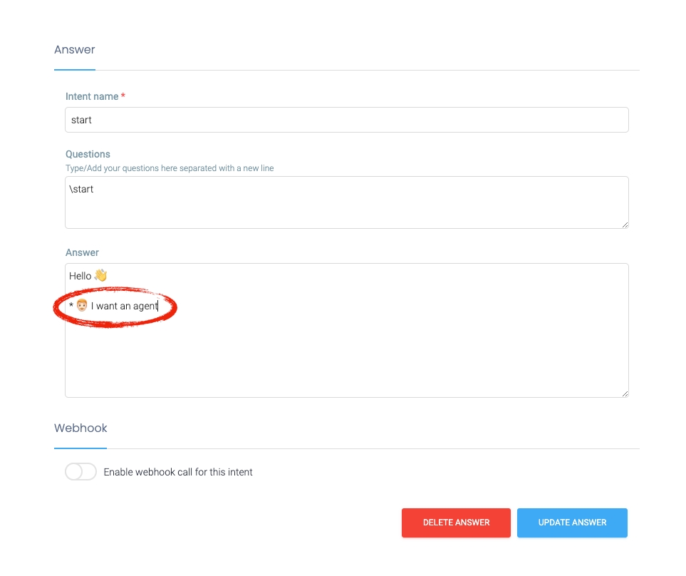 Now save the answer and go back to the intents list. Add a new answer (+ New answer button).