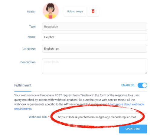 Connect your application to our chatbot. Go on Helpbot in Tiledesk Console, enable Fullfilment and put there the /bot API_ENDPOINT url that you will build by joining the replit app endpoint (see next figure) with the /bot method.