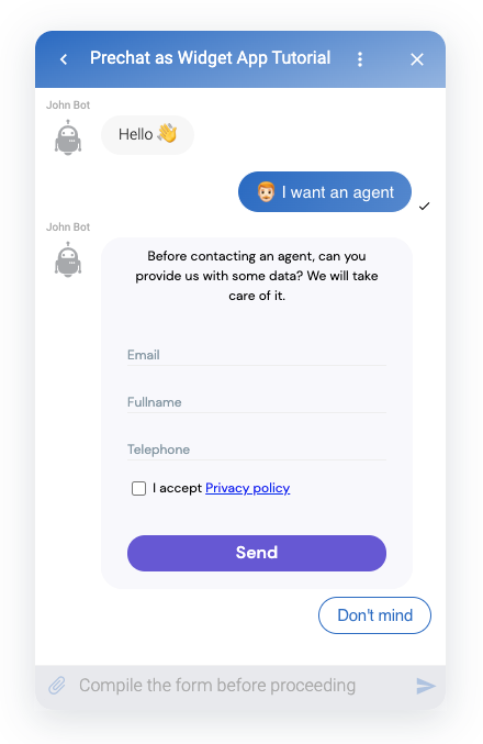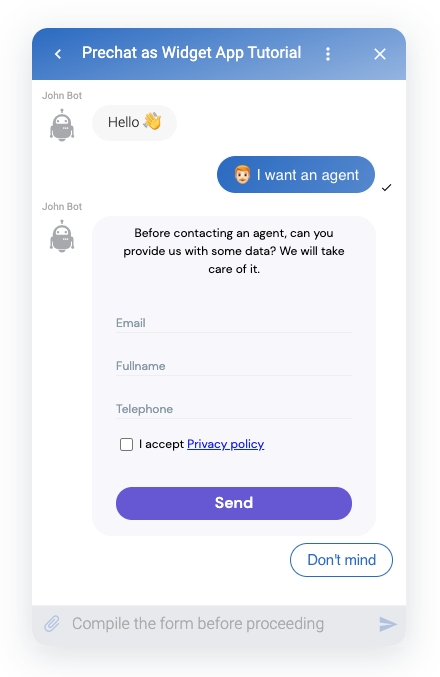 The widget's native prechat form is very userful to ask some data before starting a conversation. But sometimes you want let the end-user play around with your chatbot freely, avoiding asking him unuseful sensitive data. Just ask data only when necessary, i.e. just before talking with a human agent!
