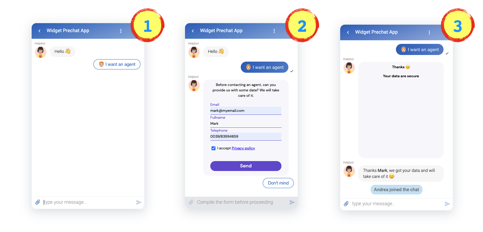 We'll discuss here exactly this use case. We'll build a chatbot, placing it in front of a department. When the user asks for an agent a form appears in the conversation flow that will ask the user some personal info (i.e. email, fullname, telephone). As soon the user fills out the form the chatbot will handoff the conversation to a human agent that can read the user data from the conversation panel.