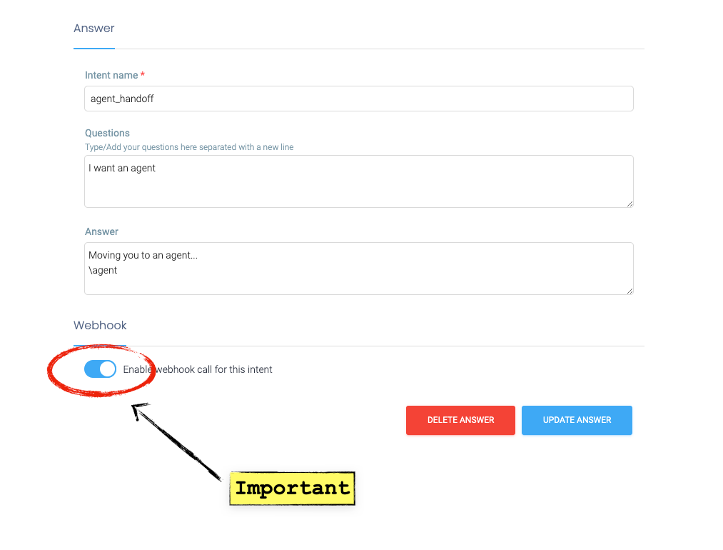 Do not forget to activate the webhook switch on the bottom "Enable webhook call for this intent". This will forward the reply to the programmatic backend logic that we'll add later in the tutorial.